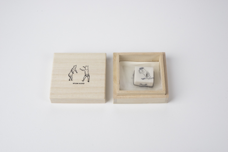 工藤あゆみがひとつひとつ手描きで箱状のセラミックの表と裏に(時には表と箱の脇に)絵と詩のような短い文を描き、そして七宝で色づけをしています。
