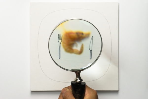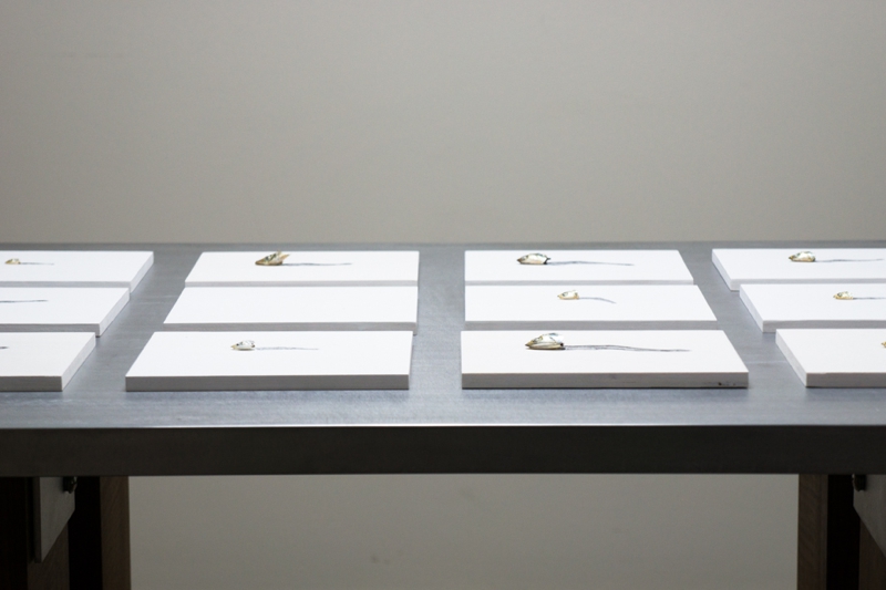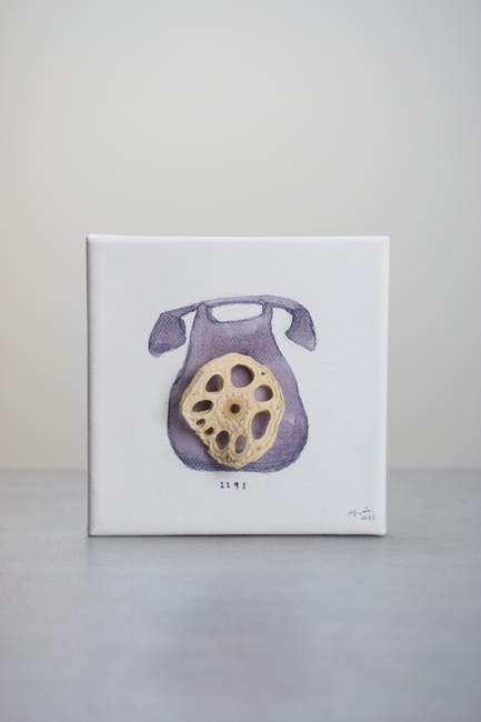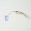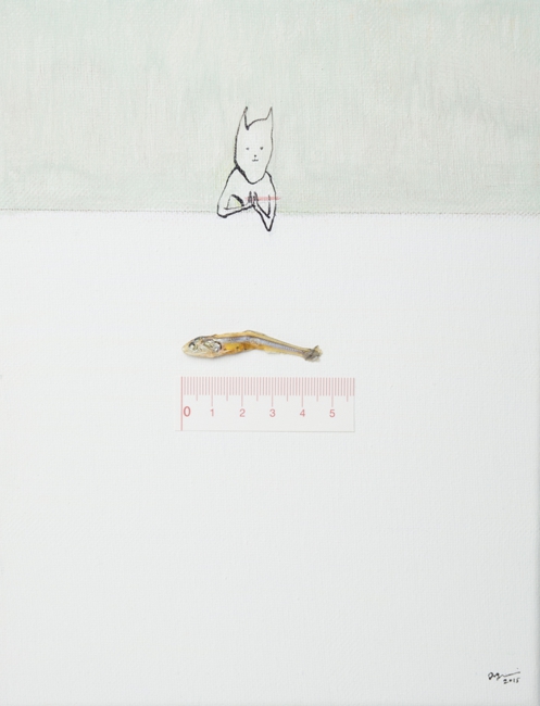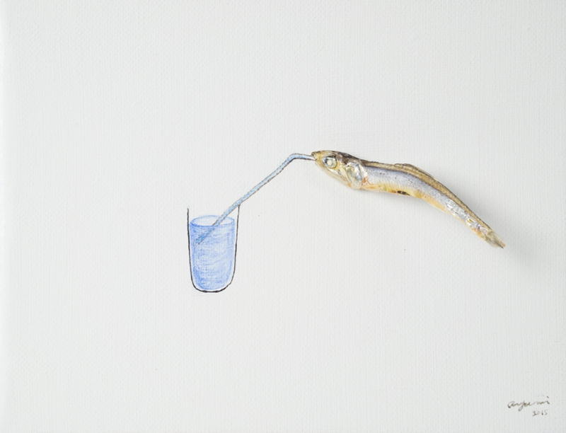 circa 4,5 cm Niboshi (sardine giovani essiccate), inchiostro, matita colorata, colore acrilico, tela