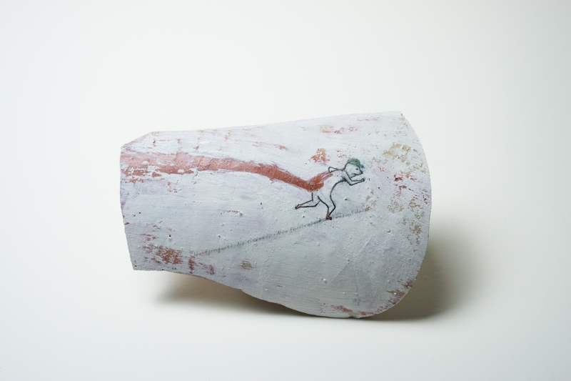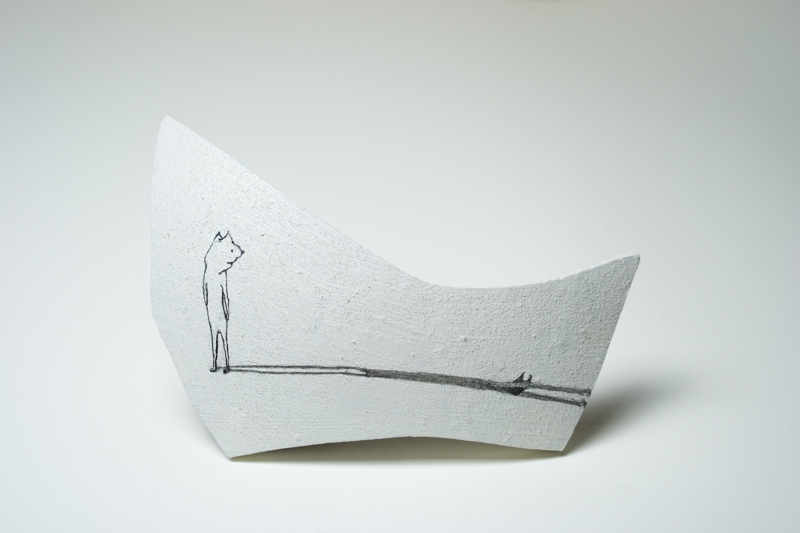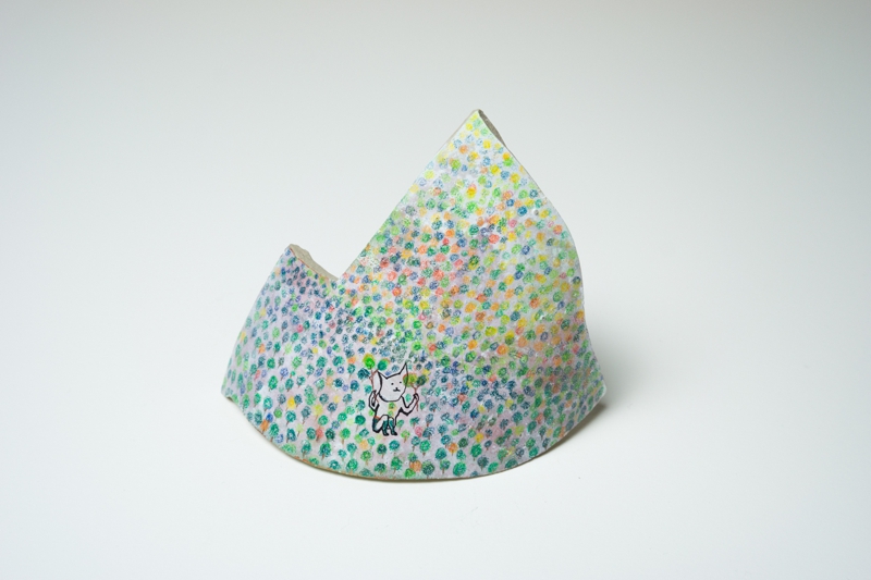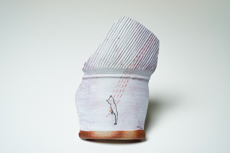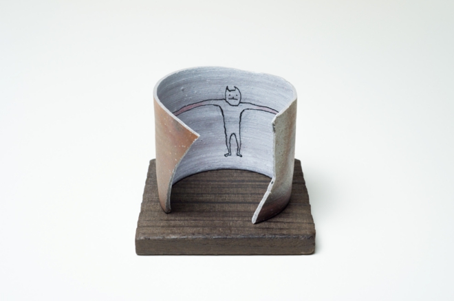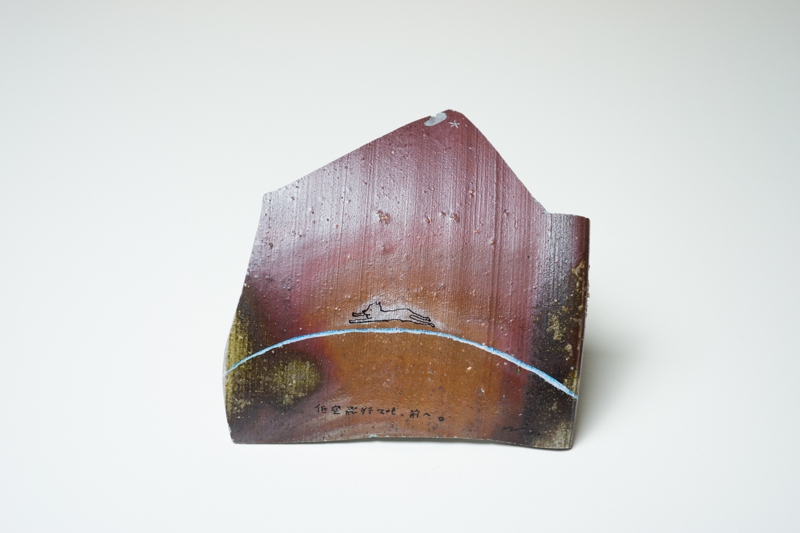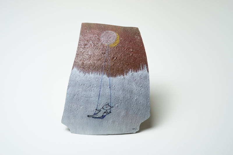 私の作品は日常の中にある、隅っこの方でキラリと輝く想いを絵と文章で描いているのですが、今回は表情豊かなカケラに導かれながら、表面の凹凸を利用してみたり、時にはとても立体的に表現してみたり、カケラの輪郭線に注目してみたりしました。備前特有の濃い色を下地にしてやわらかく輝く主人公を描くのも新鮮でした。